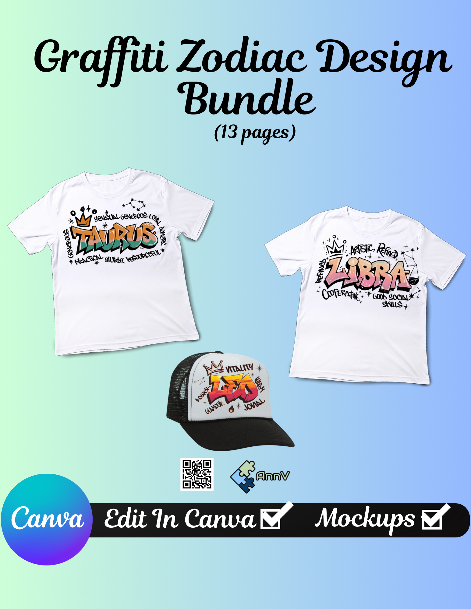 Unlock your creativity with the Graffiti Zodiac Design Bundle! This vibrant set includes 13 dynamic pages, allowing you to customize colors and add personal images. With a mockup included, you can effortlessly showcase these unique designs, and start selling right away! Transform your ideas into stunning visuals that truly stand out!
